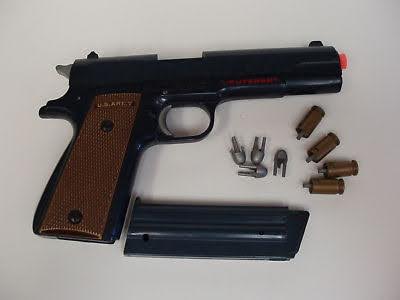 Try making and selling something like that in today’s litigious age! I can hear the parents now! You’ll lose an eye! Geez! Anyways, the springs were still too strong for my little weak kid’s fingers to push the plastic4bullet into the casing. So, I never ended up using these toys much. I don’t recall my parents helping me load them either. But, this is where my love of the 1911 came from! This toy.